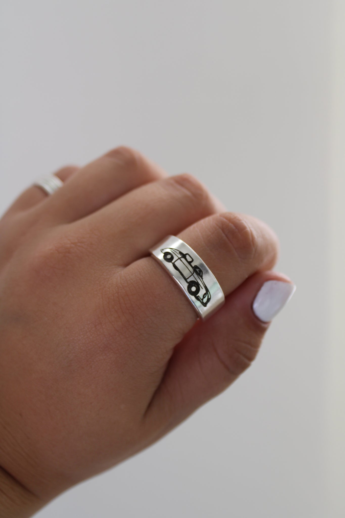This one-of-a-kind spoon ring is handmade from vintage silverplate silverware and engraved with a car. It’s already finished and ready to ship—just the way you see it.