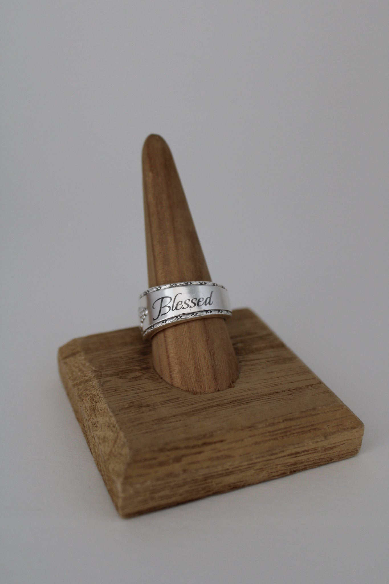 This one-of-a-kind spoon ring is handmade from vintage silverplate silverware and engraved with “Blessed”. It’s already finished and ready to ship—just the way you see it.