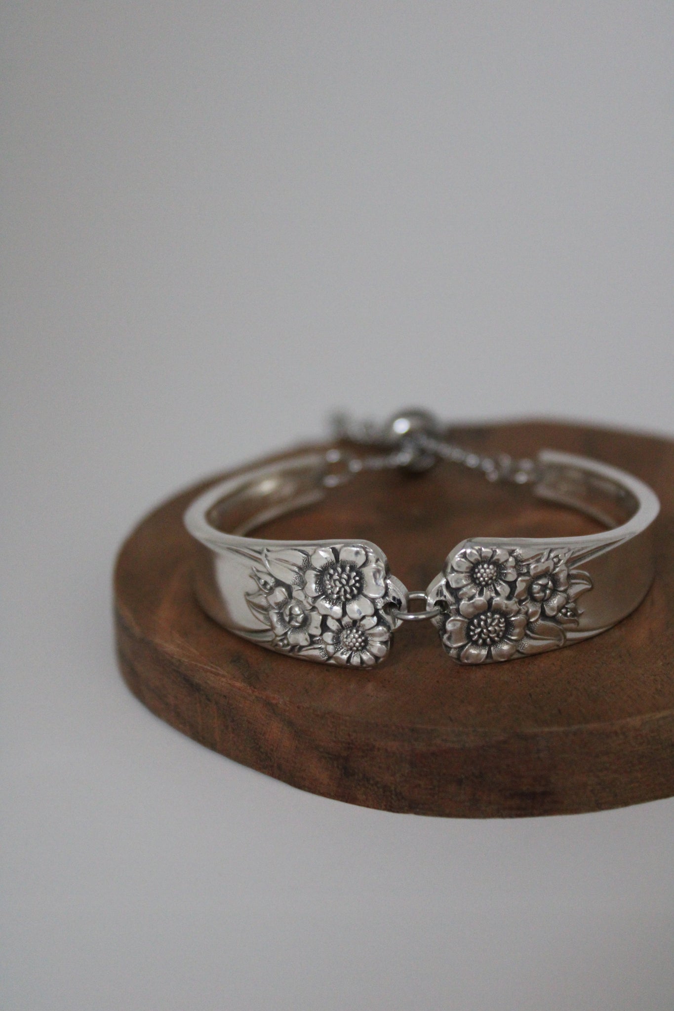 This one-of-a-kind bracelet links together two beautifully repurposed spoons to create a bold, eye-catching statement piece. Each bracelet features an adjustable slider to comfortably fit most wrist sizes.