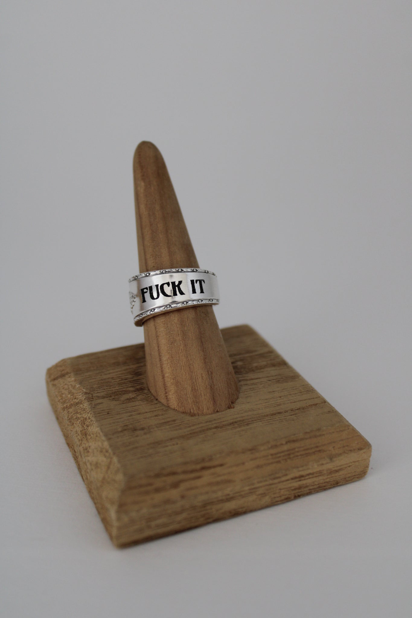 This one-of-a-kind spoon ring is handmade from vintage silverplate silverware and engraved with “Fuck it”. It’s already finished and ready to ship—just the way you see it.