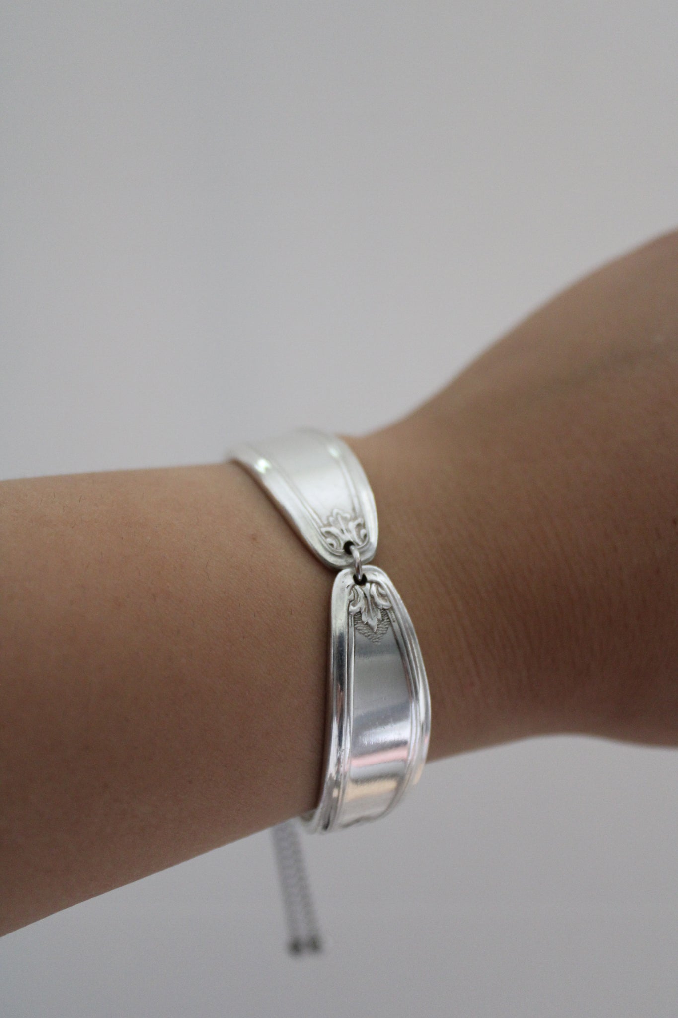 This one-of-a-kind bracelet links together two beautifully repurposed spoons to create a bold, eye-catching statement piece. Each bracelet features an adjustable slider to comfortably fit most wrist sizes.