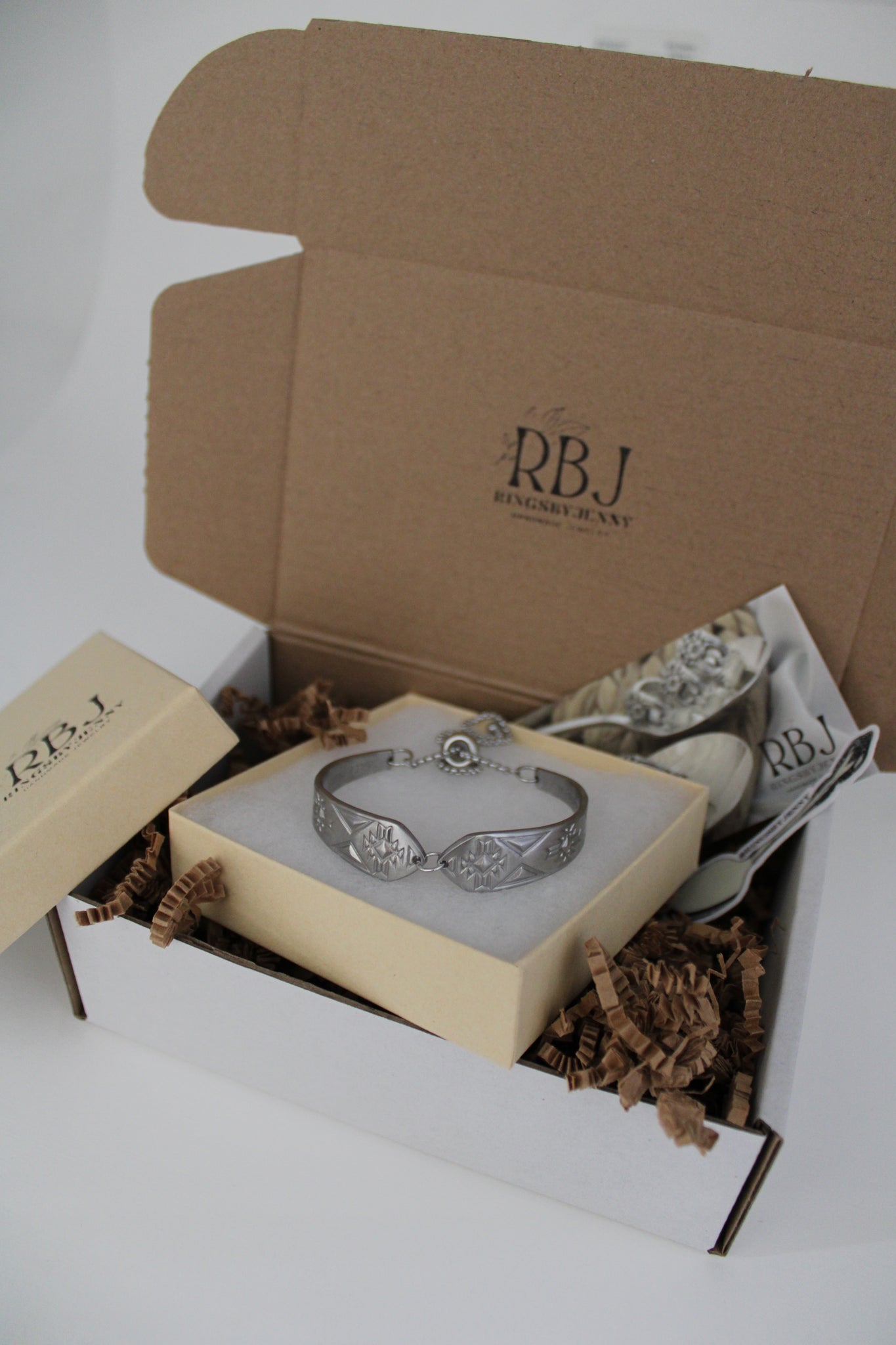 This bracelet links together two beautifully repurposed spoons to create a bold, eye-catching statement piece. Each bracelet features an adjustable slider to comfortably fit most wrist sizes.
