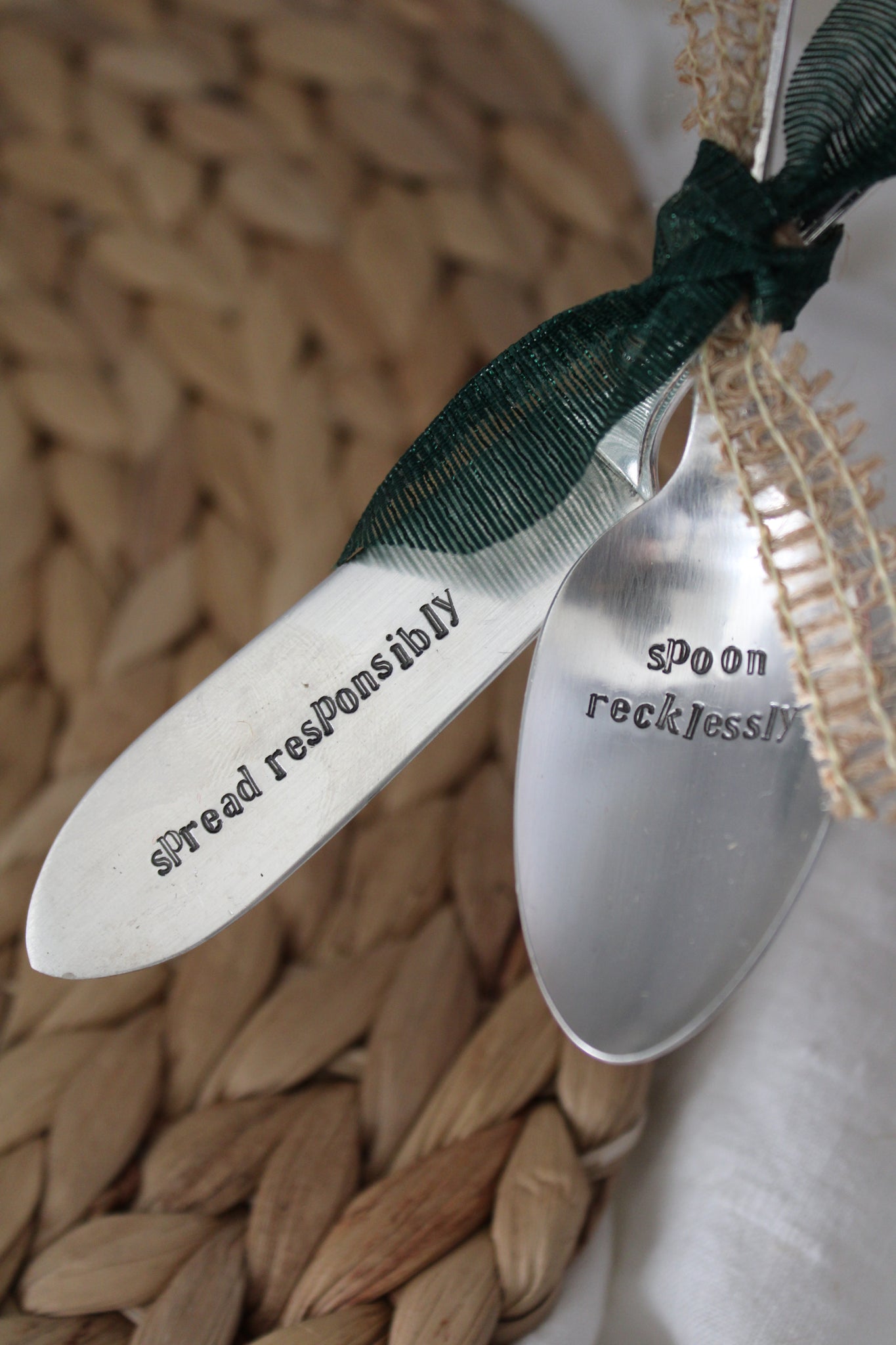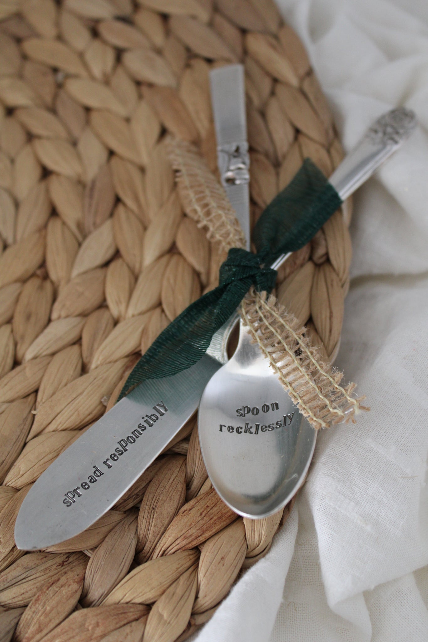 Add a little charm to your kitchen with this hand-stamped vintage silverware duo. Each set includes a repurposed butter knife and spoon that I clean, polish, and stamp by hand. Because they’re made from real vintage pieces, every duo has its own personality and no two are exactly alike. Each piece may show light vintage wear that adds to the charm
