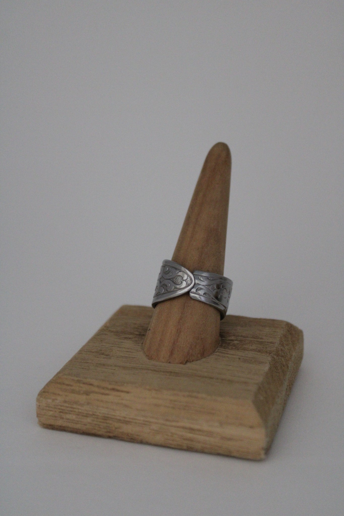 Crafted from preloved stainless steel flatware, these rings are durable and perfect for everyday wear. Resistant to tarnishing and safe to wear in water, they won’t discolor or turn your fingers green. Each ring is pre-made, non-adjustable, and designed to last. Please double-check your size before ordering. Minor scratches or imperfections may be present, reflecting the history of the material and adding unique character to each piece.